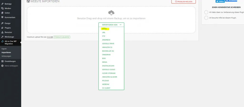 - All in One WP Migration der Firma ServMask direkt im WordPress-Plugin Bereich.