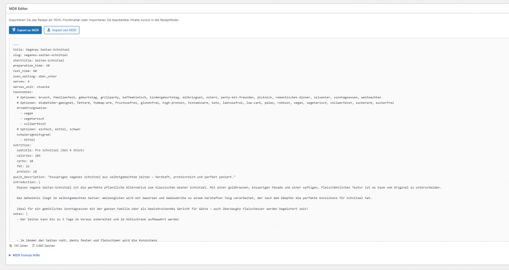 Das ändert sich mit dem MDX-Editor. Mit dem MDX Editor kann man ein Rezept inklusive aller Datenfelder wie FAQ, Zutaten, Kommentare usw. als strukturierten Text exportieren, mit KI bearbeiten und wieder importieren. Das benötigt etwas Übung, aber beschleunigt natürlich die Optimierung der Rezepte extrem.