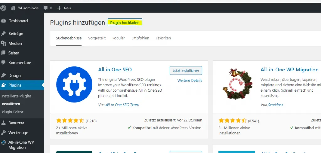 - All in One WP Migration der Firma ServMask direkt im WordPress-Plugin Bereich.
